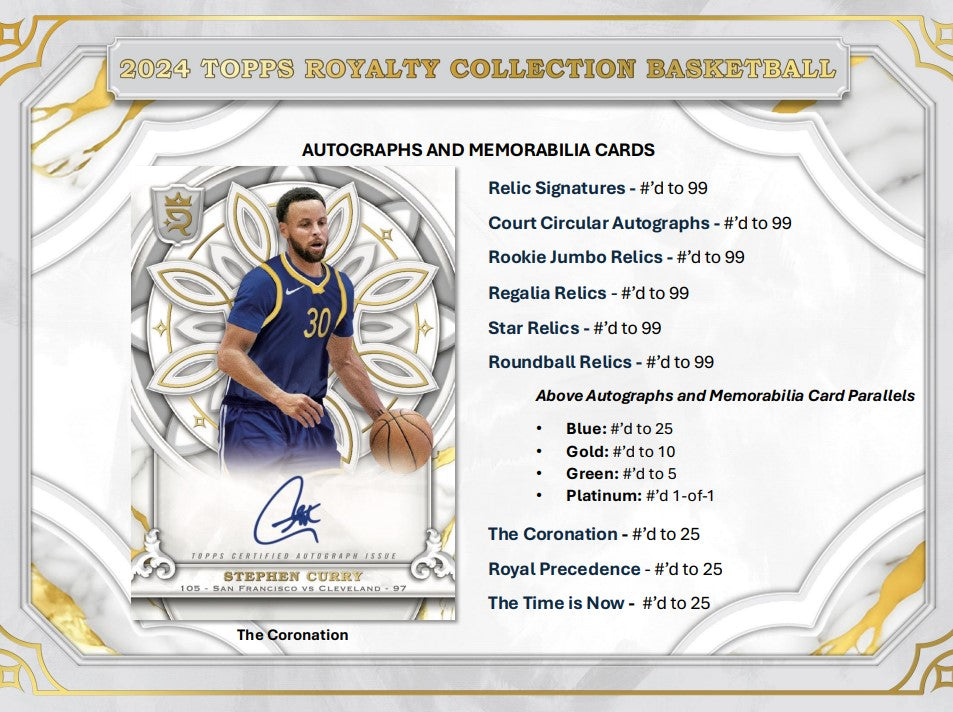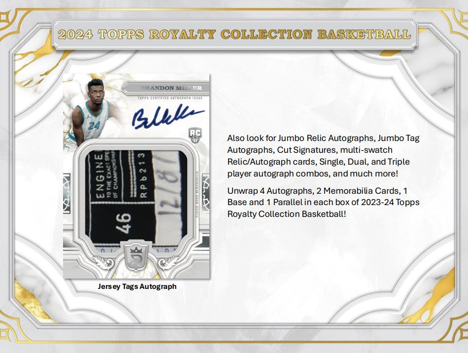 Unwrap 4 Autographs, 2 Memorabilia Cards, 1 Base and 1 Parallel in each box of 2023-24 Topps Royalty Collection Basketball!