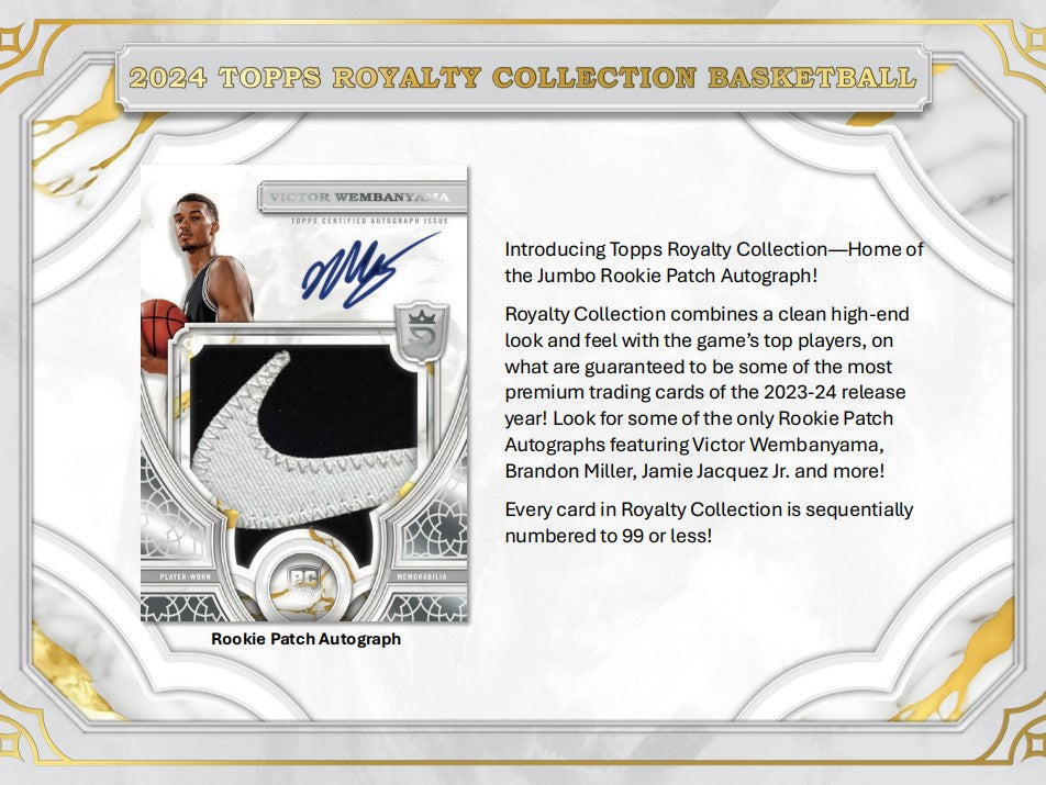 Royalty Collection combines a clean high-end look and feel with the game’s top players, on what are guaranteed to be some of the most premium trading cards of the 2023-24 release year! Look for some of the only Rookie Patch Autographs featuring Victor Wembanyama, Brandon Miller, Jamie Jacquez Jr. and more!