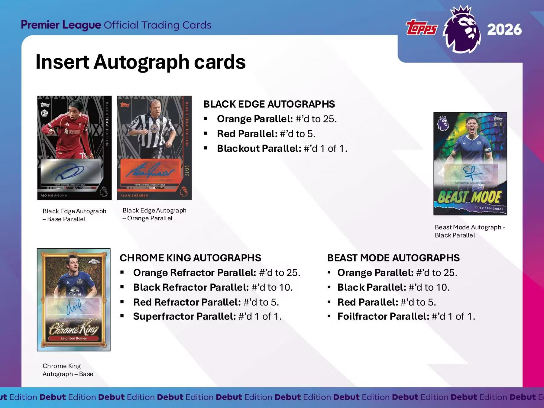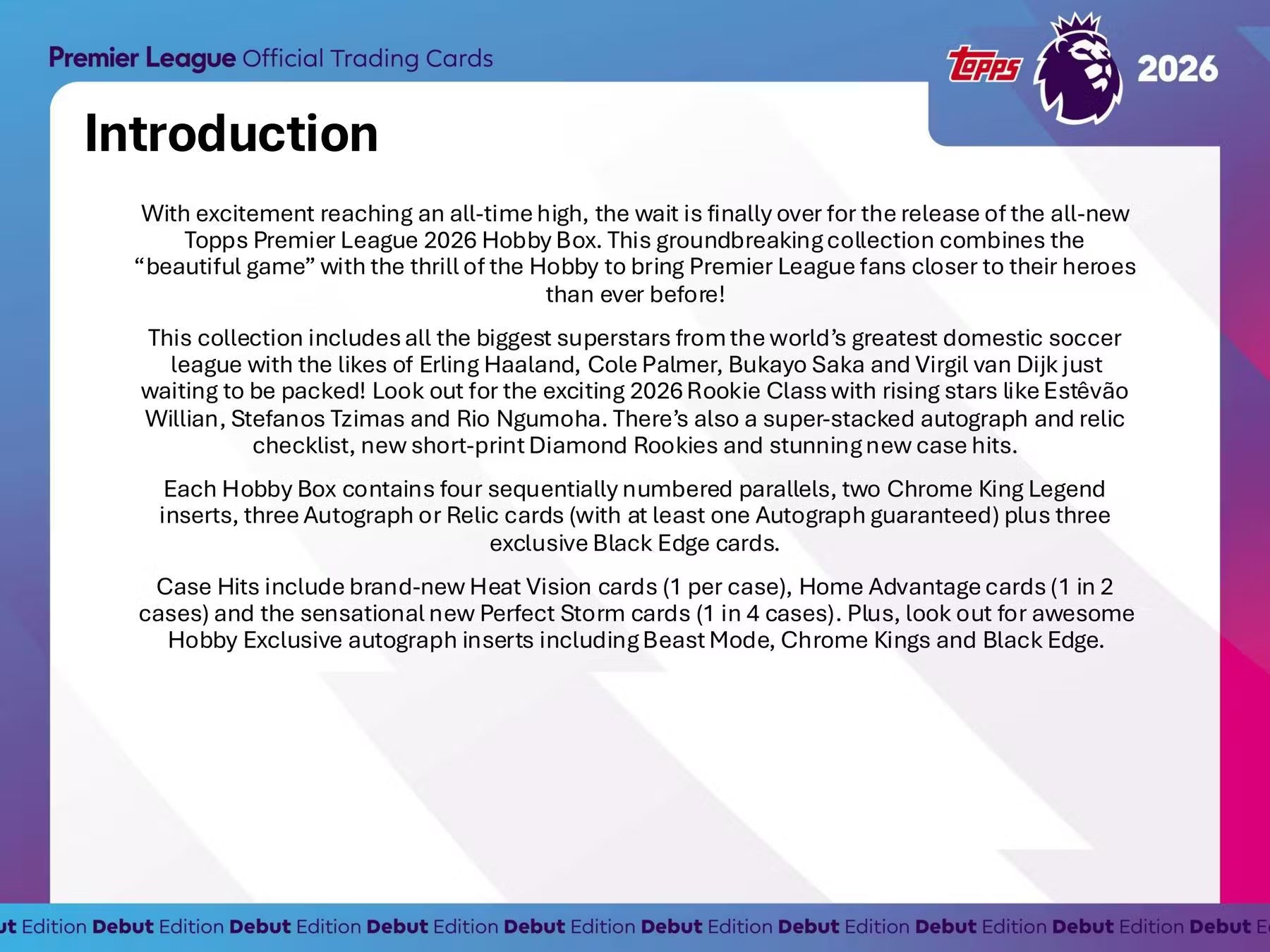 This collection includes all the biggest superstars from the world's greatest domestic soccer league with the likes of Erling Haaland, Cole Palmer, Bukayo Saka and Virgil van Dijk just waiting to be packed! Look out for the exciting 2026 Rookie Class with rising stars like Estevao Willian, Stefanos Tzimas and Rio Ngumoha. There's also a super-stacked autograph and relicchecklist, new short-print Diamond Rookies and stunning new case hits.