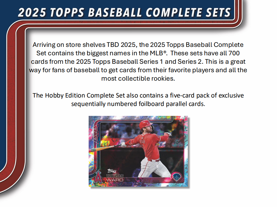 The 2025 Topps Baseball Complete Set contains the biggest names in the MLB®. These sets have all 700 cards from the 2025 Topps Baseball Series 1 and Series 2. This is a great
