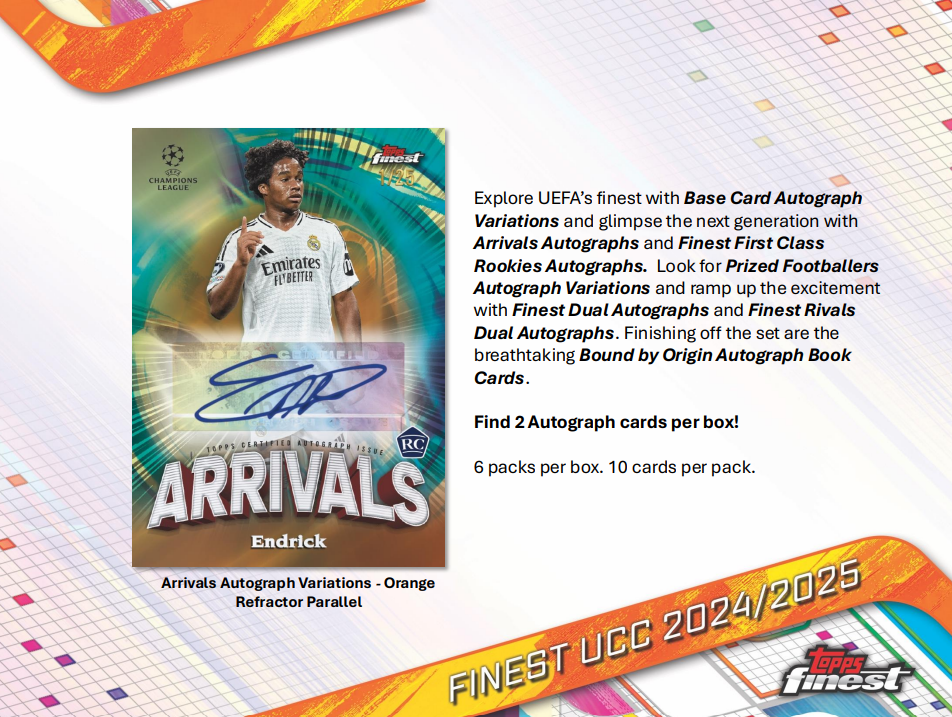 With excitement reaching new heights, Topps Finest UEFA Club Competitions (UCC) 2025 brings world-class stars, rising talents, and unforgettable icons to the famous Finest brand.