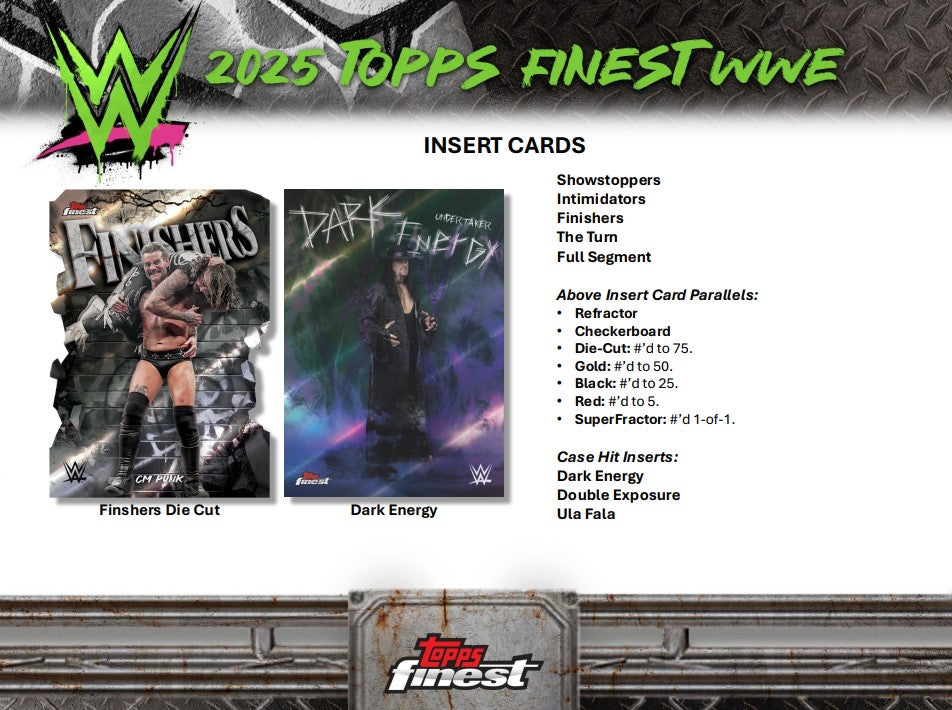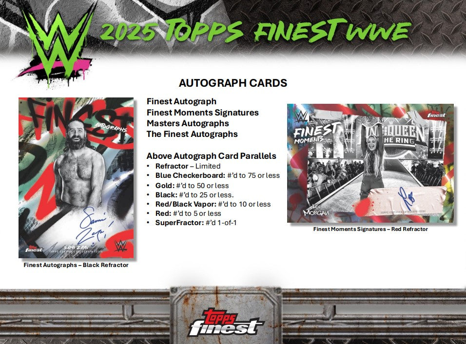Finally… Finest WWE has come back to the Hobby! Back and bolder than ever, 2025 Topps Finest WWE steps into the spotlight with a chromed-out lineup of Superstars, legends, and fan-favorite inserts. This set is a high-energy tribute to sports entertainment, built for Collectors who crave vibrant designs, premium tech, and chase-worthy pulls.