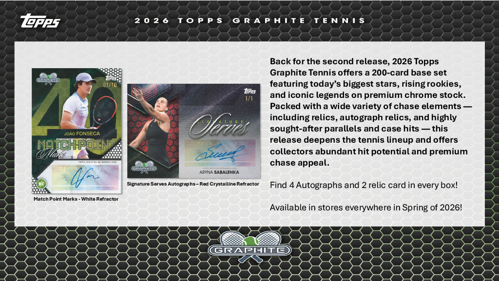 Featuring a mix of global superstars, rising rookies, and legendary champions, Graphite celebrates every era of the game while delivering a hit-driven collecting experience. Collectors chase on-card autographs, memorabilia cards, and a deep spectrum of parallels that shine against Graphite’s signature dark Chrome® finish.