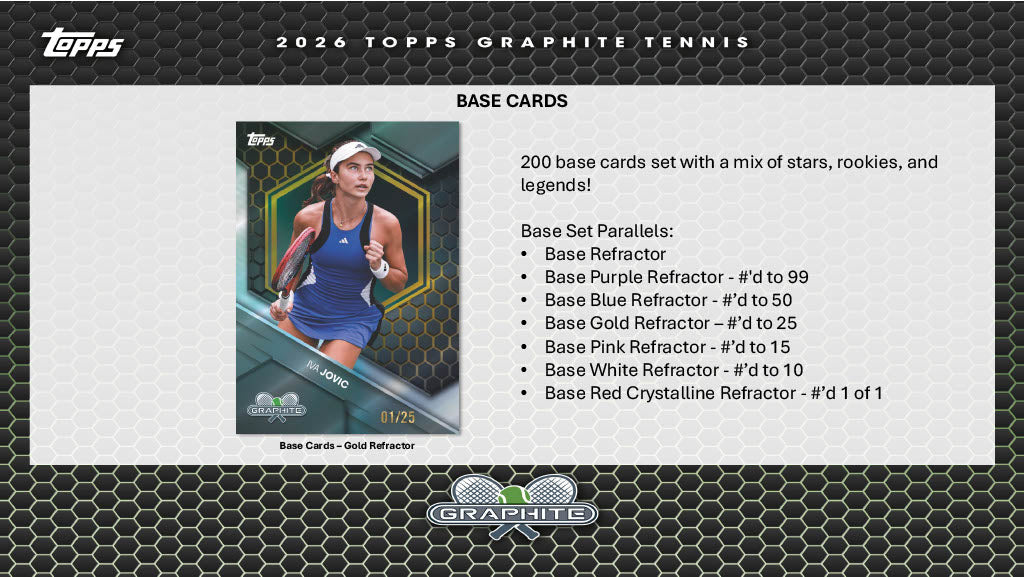 Topps Graphite Tennis brings the intensity of the tour to the Hobby through bold black Chrome® technology and a design language inspired by the graphite of the modern racket. Built to highlight the speed, precision, and power of the sport, Graphite pairs striking silver tones with vibrant refractor color to create one of the most visually dynamic tennis releases in the Topps portfolio.